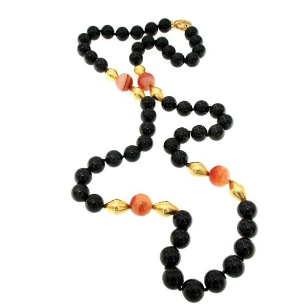 Collana lunga con inserti di oro giallo di onice nero e corniola.