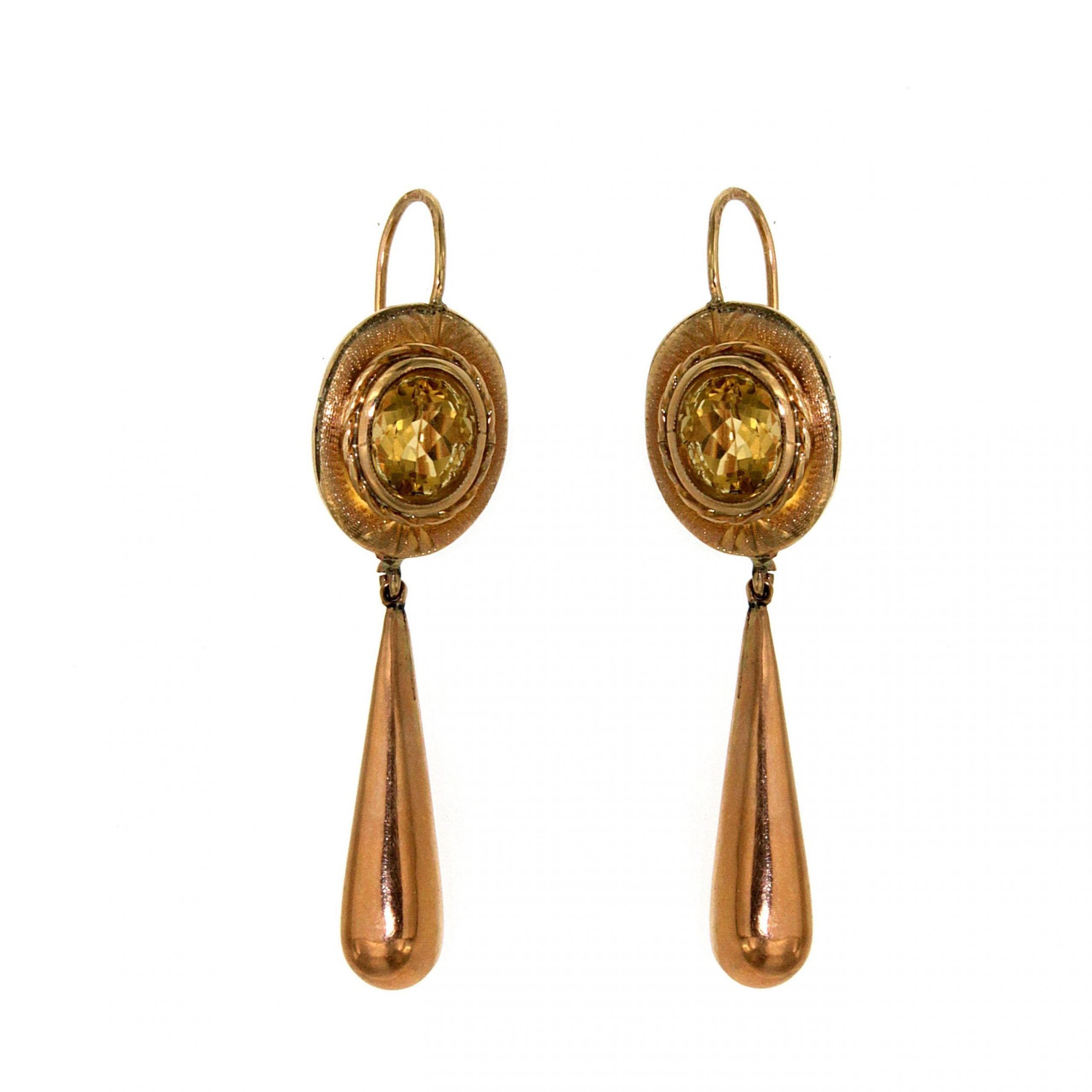 Orecchini in oro rosa con incastonata una gemma di quarzo citrino sfaccettata.